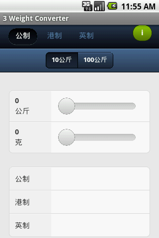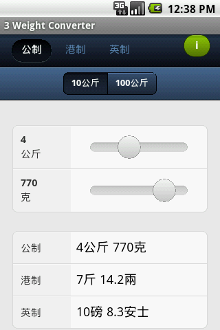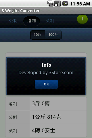 3Weight Converter for Android, Freeware Requirements: Android V2.1 or above What is it ? It is a simple weight converter. It converts among Kg <=> Catty <=> Lb How to use Tap the button on the first row to choose a system Tap the button on the second row to choose the range Slide those two sliders, the conversion will be display on the bottom 3 lines Switch System Tap the button on the first row to choose a system 3Weight has been tested on Archos IT70 (Android 2.2) – OK Android Emulator (Android 2.1) – OK Download Share this: Click to share on Facebook (Opens in new window) Click to share on Twitter (Opens in new window) More Click to share on LinkedIn (Opens in new window) Click to print (Opens in new window)