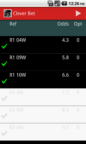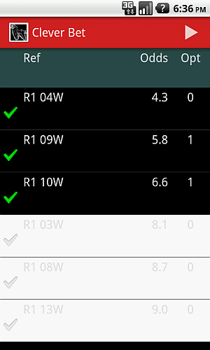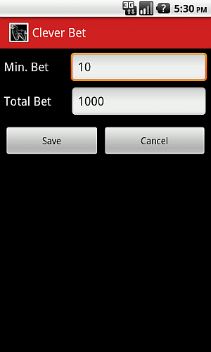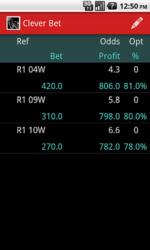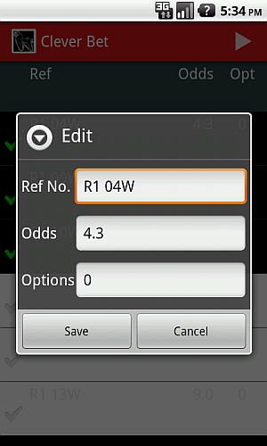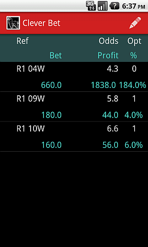 What is this It is a tool / calculator to assist you to implement a dutch betting strategy.If you want to make a bet on more than 1 horse, it can help to predict the return and minimize your risk. It is suitable for horse racing, harness, soccer, football, ruby โฆetc. It lets you calculate your bets when you are in the race course, so that you can make you decision in the last minute. Press the โCalcโ button to start How to use Press a bet item to edit that bet.Press a โcheckโ mark to enable or disable that bet. Edit Ref (optional field) horse no or any ref info Odds eg. โ4.3โ Options 0 => dutch auto calc 1 => x1 or break even any no. => xN times of total bet Setting Minimum bet, the lowest allowed bet Total bet, the default total bet for calculation Bet example Example, Dutch Betting Example, Fixed Return Bet example 1 If you want to bet 3 horses, No. 4 win odds=4.3, in the option field, fill in โ0โ for dutch betting No. 9 win odds=5.8, in the option field, fill in โ0โ for dutch betting No. 10 win odds=6.6, in the option field, fill in โ0โ for dutch betting Press the โPlayโ button on the upper right hand corner to start calculation. The program then suggest you to: Bet 420 for No. 4 win, Bet 310 for No. 9 win, Bet 270 for No. 10 win When one of your bets win, you can get ~80% profit, therefore you will get back ~ 1800. Press the โPenโ button on the upper right hand corner to go back to the bet list screen. Bet example 2 If you want to bet 3 horses, break even when No. 9 or No. 10 win, gain profit when the favourite No. 4 win. No. 4 win odds=4.3, in the option field, fill in โ0โ for dutch betting No. 9 win odds=5.8, in the option field, fill in โ1โ for fixed return No. 10 win odds=6.6, in the option field, fill in โ1โ for fixed return Press the โPlayโ button on the upper right hand corner to start calculation. The program then suggest you to: Bet 660 for No. 4 win, Bet 180 for No. 9 win, Bet 160 for No. 10 win When No. 9 or No. 10 win, you can get back ~1000 (break even) When No. 4 win, you can get back ~2800, (~180% profit) Press the โPenโ button on the upper right hand corner to go back to the bet list screen. Requirements: Android 2.2 or above Thanks to: Alex Lockwood Handling Configuration Changes with Fragments Jeff Gilfelt Action Bar Style Generator DownloadviaGoogle Play Store Share this: Click to share on Facebook (Opens in new window) Click to share on Twitter (Opens in new window) More Click to share on LinkedIn (Opens in new window) Click to print (Opens in new window)